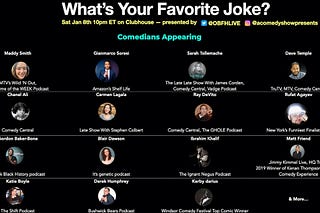 Comedians Sharing Their Fave Jokes — TONIGHT 10pm ET on Clubhouse (+Rawkus & Drill playlists)